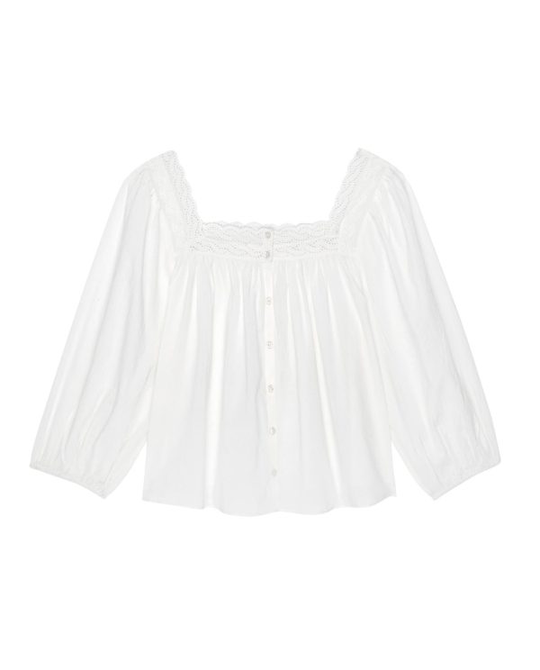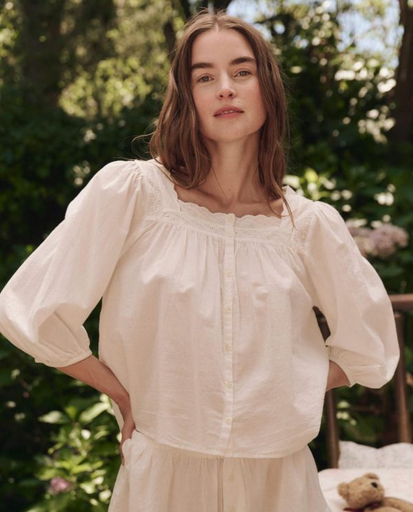 The Eyelet Button Sleep Top. is a romantic addition to your sleepwear collection. Crafted from supersoft and lightweight cotton voile fabric, the top is adorned with a Victorian-inspired eyelet lace trim and finished with a delicate scalloped edge. This top was designed to fit easy through the body for added comfort and features elasticated sleeve openings with delicate volume and dainty buttons up the front. Pair it back to the matching The Eyelet Easy Sleep Pant. or vintage denim for a casual daytime look.