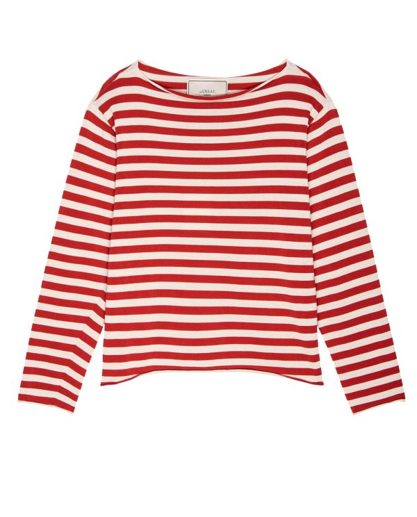 Inspired by a 19th-century nautical uniform, The Sailor Sweater is spun from lightweight cotton yarn. It features a boxy, relaxed fit, wide raw edge boatneck, two-color horizontal stripes, and a longer length. Perfectly slouchy, roll the sleeves and tuck it into your favorite jeans.