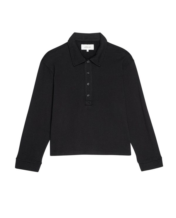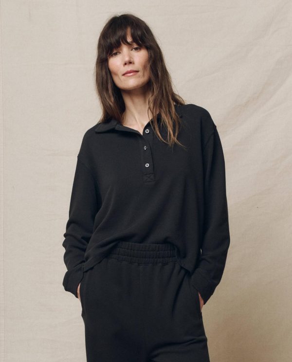 This boxy, straight-fitting top features a clean turnback hem, slightly dropped shoulders, and straight sleeves with a self-cuff for a put-together, cozy feel. A classic placket with natural shirting buttons and a self polo collar adds timeless detail. Pair with The Victory Sweatpant for an effortless look. Our knits are crafted here in L.A., ensuring beauty and uniqueness in that no two pieces are alike.